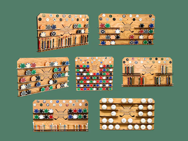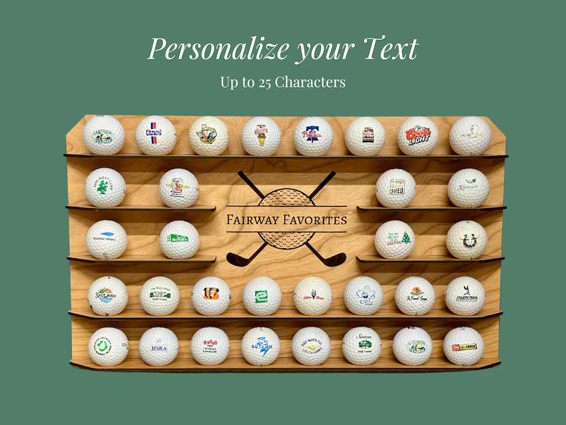 This Father's Day, give Dad a winning hand by getting him a custom wall-mounted golf ball display. This unique golf ball holder is the ideal present for the golf-loving father who likes to collect golf balls from tournaments, best rounds, or favorite courses. It is handcrafted from cherry veneered wood and has a rich clear coat finish. With secure mounting gear included, this stylish wall display is ready to hang and can store up to 49 golf balls. With up to 25 engraved characters—his name, a humorous golf