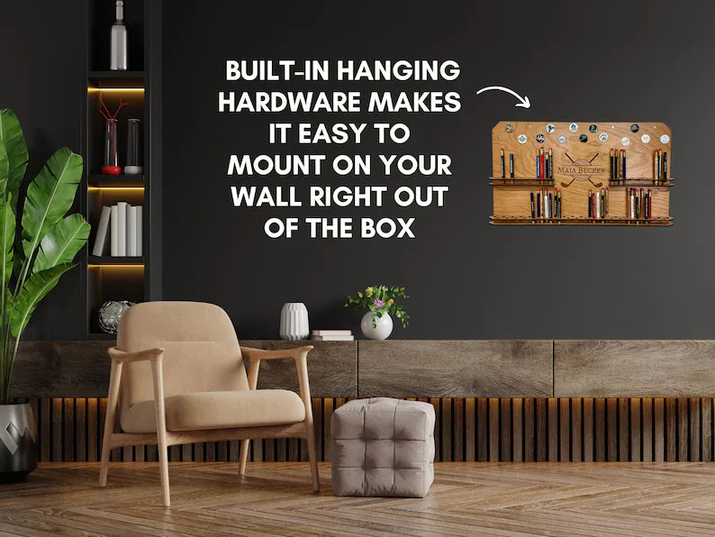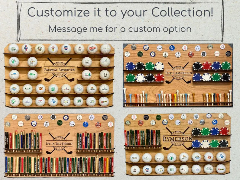 I carefully craft each display from beautiful cherry veneered wood, finished with a clear coat to bring out the natural grain. This unique piece is not only functional but also an eye-catching piece of golf decor for your home or office. The built-in hanging hardware makes it easy to mount on your wall right out of the box, so you can start displaying your collection immediately!
