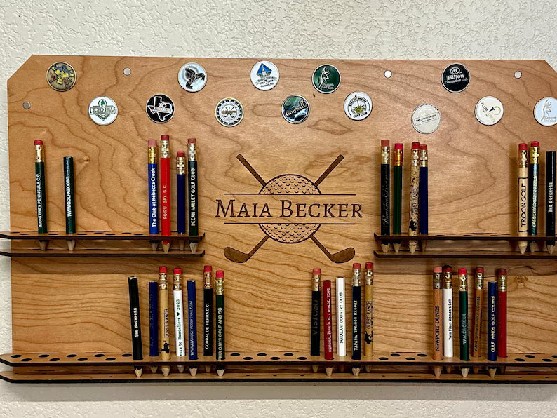 Celebrate your love for golf with this Personalized Wall-Mounted Golf Pencil Holder & Ball Marker Display! This handcrafted display is the perfect way to showcase the pencils and ball markers collected from all of your favorite courses. With its elegant design and customizable features, it's an ideal gift for avid golfers, making it a standout present for the holiday season or any special occasion.
