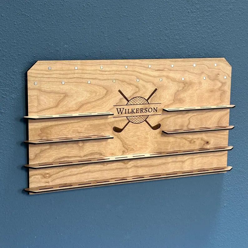 This Personalized wall-mounted display holds both magnetic and poker chip style ball markers. It comes with hanging hardware already in place so that you can display it straight out of the box. I have four other variations to accommodate what people collect so check out my other versions linked below.